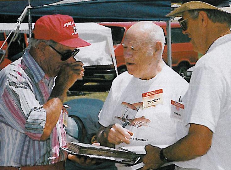 3. “Maxwell Bassett (L), Bill Brown (C), and Dick Kohl share scrapbook memories. Bassettt and Brown pioneered gas modeling.” (Source: Model Aviation, November 1996)