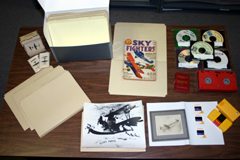 The museum's oldest records and audio/visual materials are found in the archives, stored in acid-free folders and boxes. (Left, from top: World War II spotter cards, acid-free flip-top box, Sky Fighters pulp novel, CD-ROMs and DVDs, booklet, VHS cassette tape, slides, photographic prints, and acid-free folders. Right: Scrapbook from Percy Pierce Collection.) |