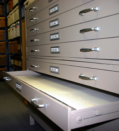 One of our map case drawers opens to reveal oversized acid-free folders. These folders contain larger certificates, posters, panoramic photographs and more.